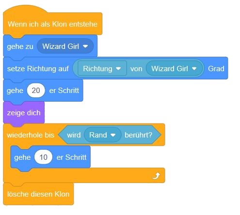 Der kleine Ball soll aus dem Ärmel der linken Hand der Hexe erscheinen, dann geradeaus fliegen und am Rand des Bildschirms verschwinden. Er soll mit der Leertaste abgefeuert werden können.