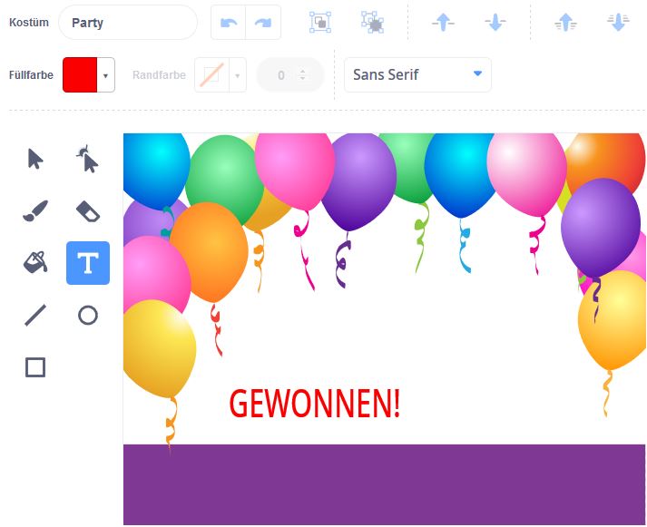 Wähle als zweites Bühnenbild Party und schreibe den Text "GEWONNEN!" hinein.