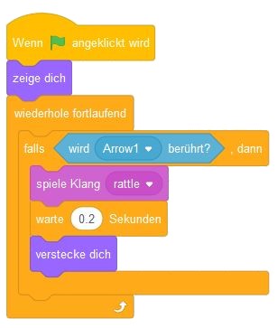 Falls ein Wächter von einem Pfeil getroffen wird (falls <wird Arrow1 berührt?>), soll er verschwinden (verstecke dich).
