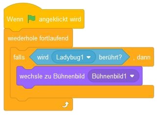 Sobald der Käfer einen Wächter berührt (falls <wird Ladybug1 berührt?>), soll das Spiel aus sein (wechsle zu Bühnenbild1), heißt Game over!