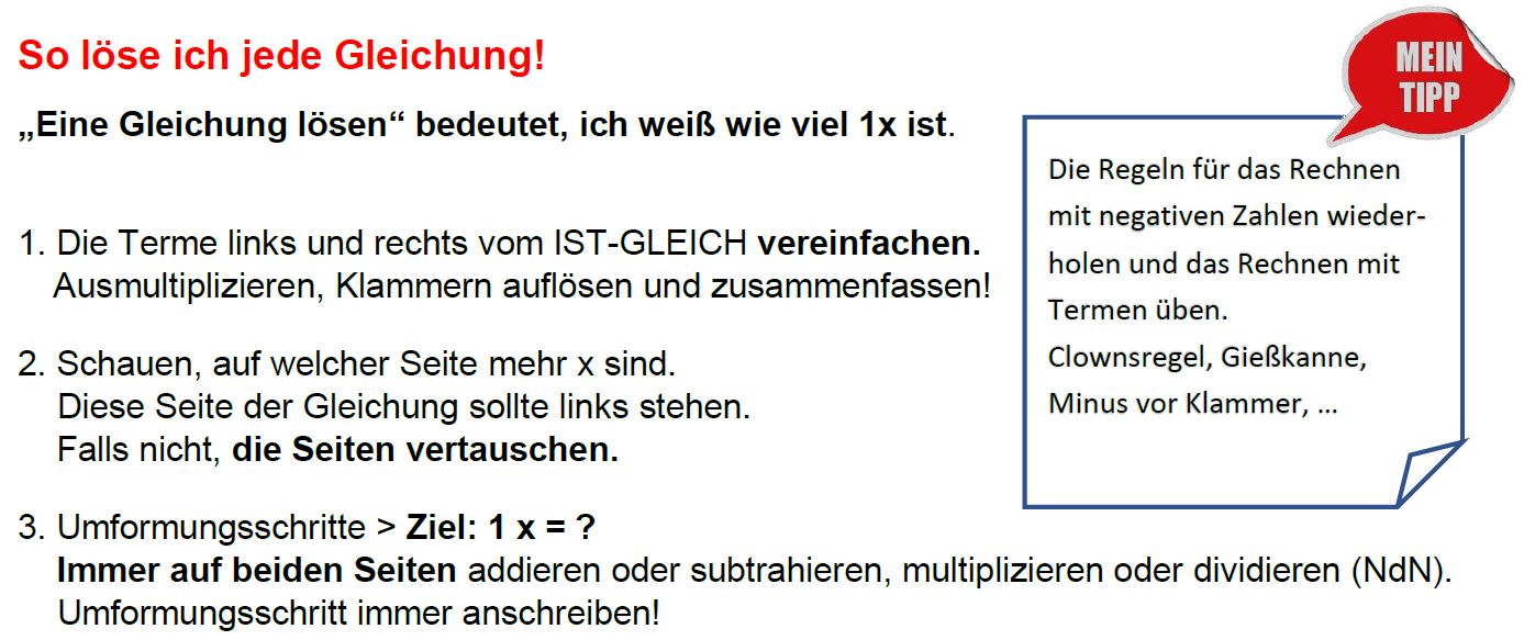 Kommen in einer Gleichung Klammerausdrücke vor, so müssen diese zuerst aufgelöst werden. Anschließend wird die Gleichung durch Äquivalenzumformungen so lange vereinfacht, bis die Unbekannte (Variable) allein auf einer Seite steht.